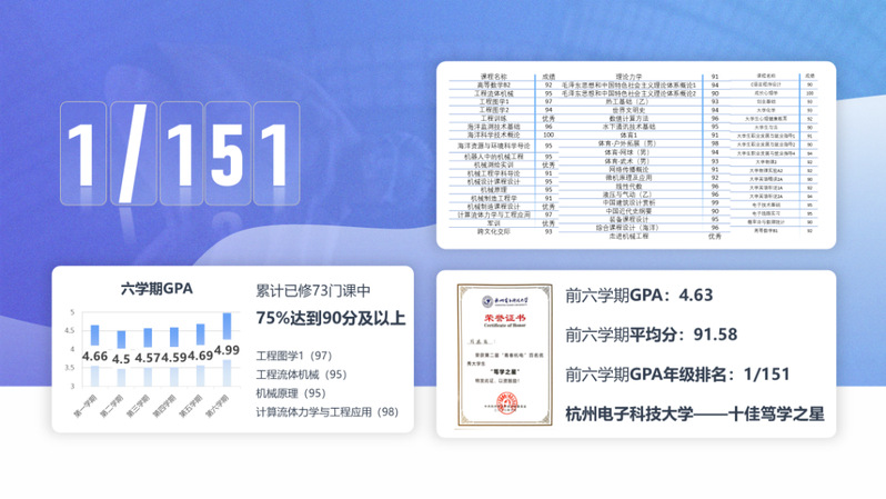通过保研(仅有1%的保研率)被西北工业大学录取,研究方向为“基于VR/AR的信息物理融合制造技术”!获国家留学基金委优秀本科生公派留学资格!大学期间平均学分绩点稳位居年级(151人)第一!获一等奖学金6次,国家奖学金1次,省政府奖学金1次!曾获全国大学生机械创新设计大赛一等奖、全国慧鱼工程技术创新大赛一等奖、全国大学生“互联网+”创新创业大赛铜奖!申报发明专利6项、授权实用新型专利1项……