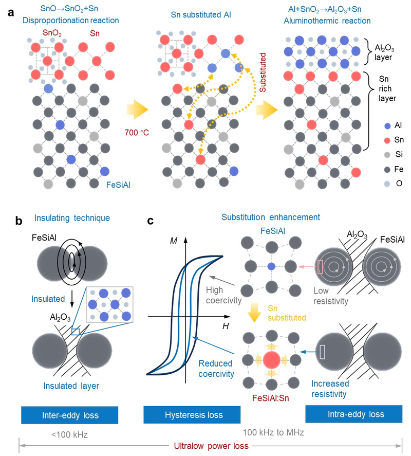 图1. Origination of FeSiAl:Sn/Al2O3 structure. a, Schematic diagram of the substitution of Sn and formation of Al2O3 by mutual diffusion. b-c, Schematic representation of the power loss suppression mechanism in FeSiAl:Sn SMCs. Inter-eddy loss is effectively mitigated through the incorporation of an insulating Al2O3 layer (b). In parallel, hysteresis and intra-eddy losses are suppressed by substituting Sn for Al, which results in a reduction of coercivity and an increase in electrical resistivity (c).